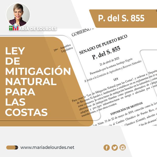 P.del S. 855 para crear la Ley de Mitigación Natural para las Costas, y ordenar al Departamento de Recursos Naturales y Ambientales a establecer en su reglamentación el uso en la zona costanera de estructuras de mitigación
