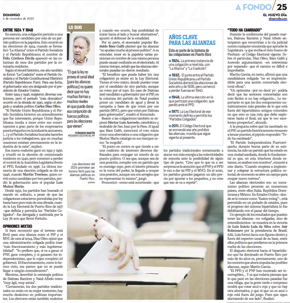 concertada, que tenga efecto electoral positivo, va mejorando de día en día camino a las próximas elecciones. Así que creo que el que la ley no provea el canal ideal (para las alianzas políticas) no quiere decir que no hay muchas formas y muchos niveles en que puede darse esa conjunción de fuerzas políticas para las elecciones que vienen”, mencionó, en entrevista con El Nuevo Día, el líder independentista Fernando Martín García.