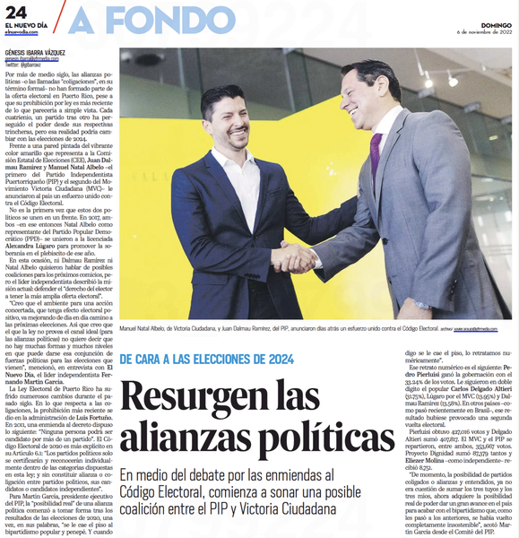 más energía a las colectividades de minoría ante la posibilidad de algún tipo de pacto. “Creo que lo que va a ser sorpresa es la atención que el PNP y el PPD le van a dar (al PIP y el MVC). En el 2020, los partidos grandes pagaron un alto precio por ignorar a los pequeños, y no creo que eso se va a repetir”.