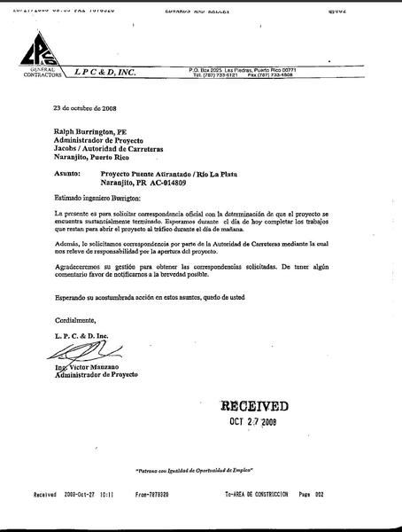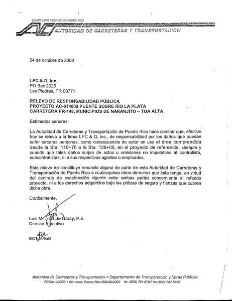 Autoridad de Carreteras y Transportación (ACT) sobre la investigación de la construcción del puente atirantado en Naranjito. Comencé a revisar el voluminoso expediente y pude confirmar la denuncia pública sobre la existencia de un “revelo de responsabilidad” a la constructora otorgado por la ACT para que el Gobernador incumbente del PPD inaugurara, una semana antes de las elecciones (24 de octubre de 2008), la referida obra pública al son de “mítin” político. Otro ejemplo más que ilustra cómo