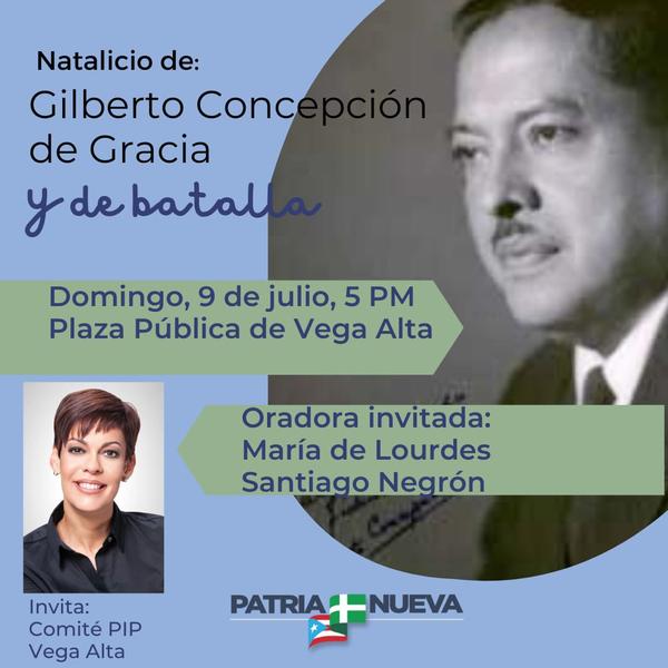 Natalicio de Gilberto Concepción de Gracia. Domingo 9 de julio | 5 PM | Plaza Pública de Vega Alta. Oradora: María de Lourdes Santiago Negrón.