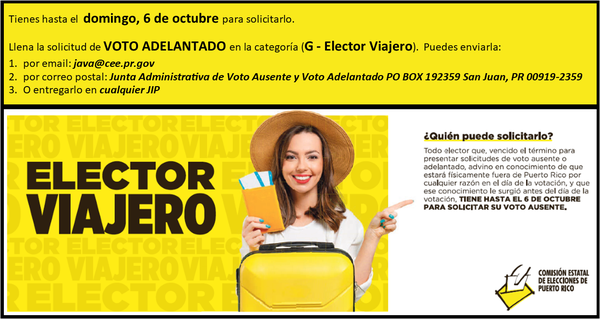 solicitar el VOTO ADELANTADO (categoría G - Elector Viajero): domingo, 6 de octubre.