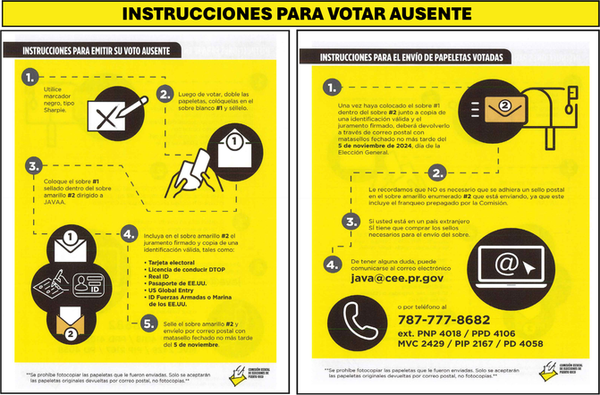 - Etiqueta con franqueo pre-dirigida a la Junta Administrativa de Voto Ausente y Adelantado para el envío de su(s) papeleta(s) votada(s).